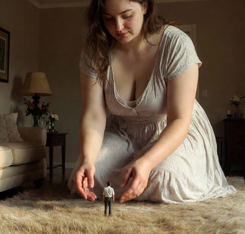 Sometimes being a giantess gets lonely and having a shrunken man to play with sounds like so much fun! Posting a personals ad online, I will invite a man over to come and have some fun with me. When they show up, I will have a note taped to the door telling them to enter and have a seat in the dining room. Once there, they will see a decanter of wine next to another note inviting him to have some while I finish getting ready and then come and meet him for drinks and dinner. Little does he know that I dabble in potions and alchemy and have concocted a little surprise for him waiting in that wine. When he finishes the first glass, he will realize that it was a shrinking potion that made him into a tiny man! At that point, I make my way downstairs and find him sitting on the chair in a frantic state. He knows he is in for a time now!